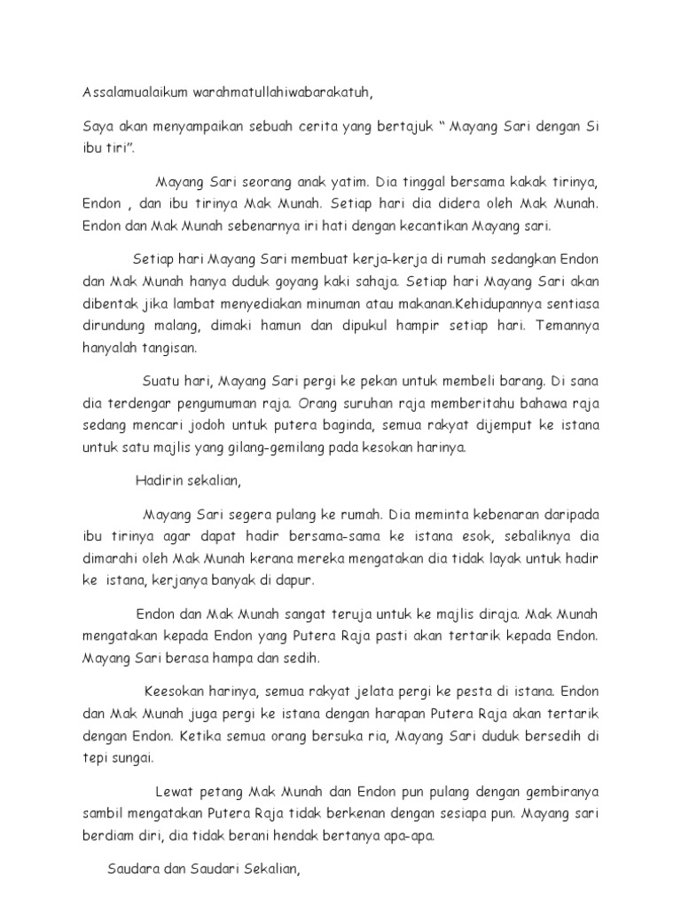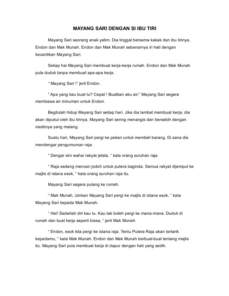 By SELMA AGUSTIN ADININGTYAS and ARITA PUSPITORINI. Sang ibu tiri segera menyiapkan makanan yang enak-enak untuknya. Mendengar hal itu ayahnya.